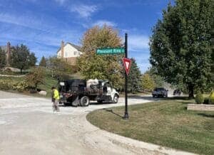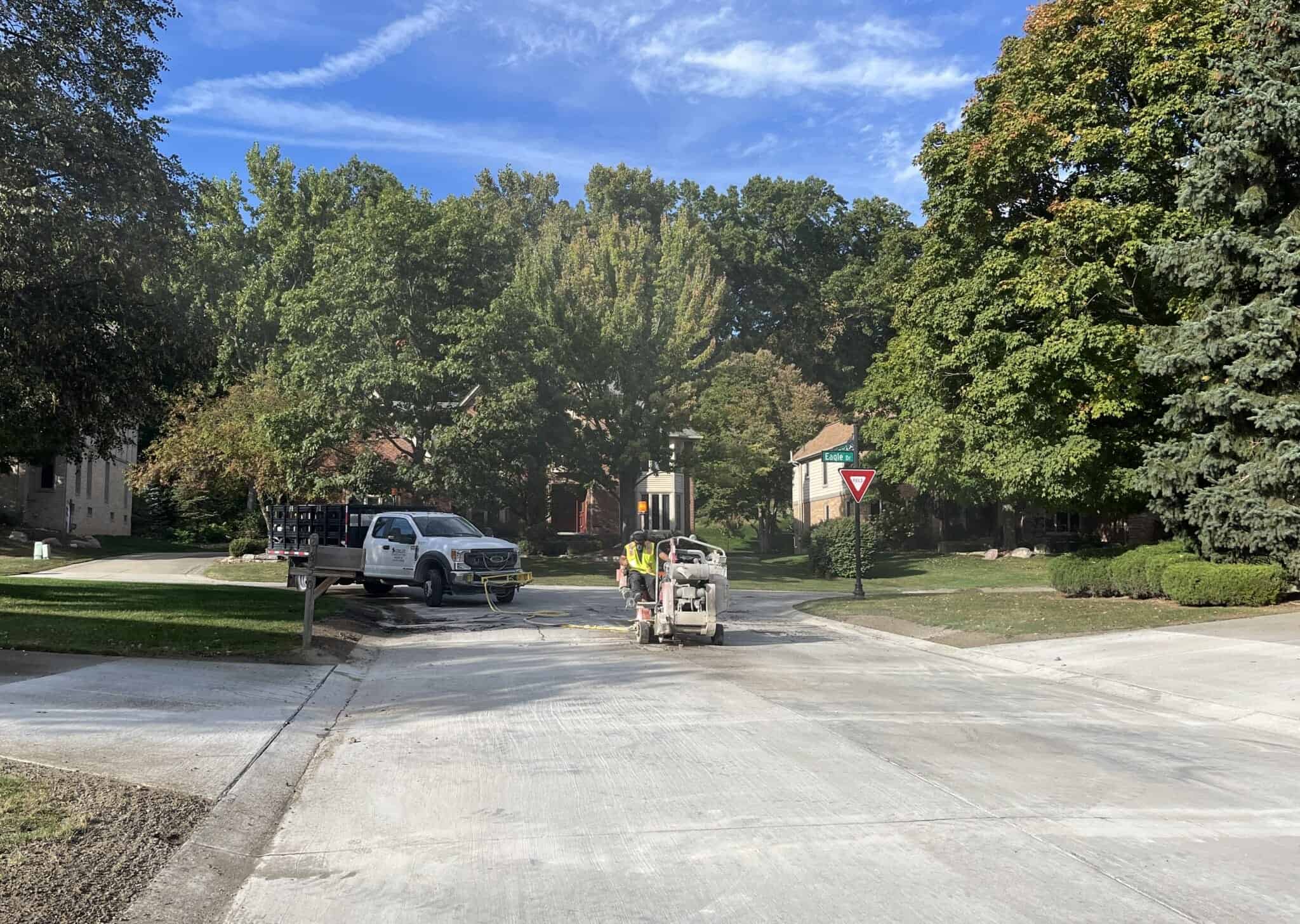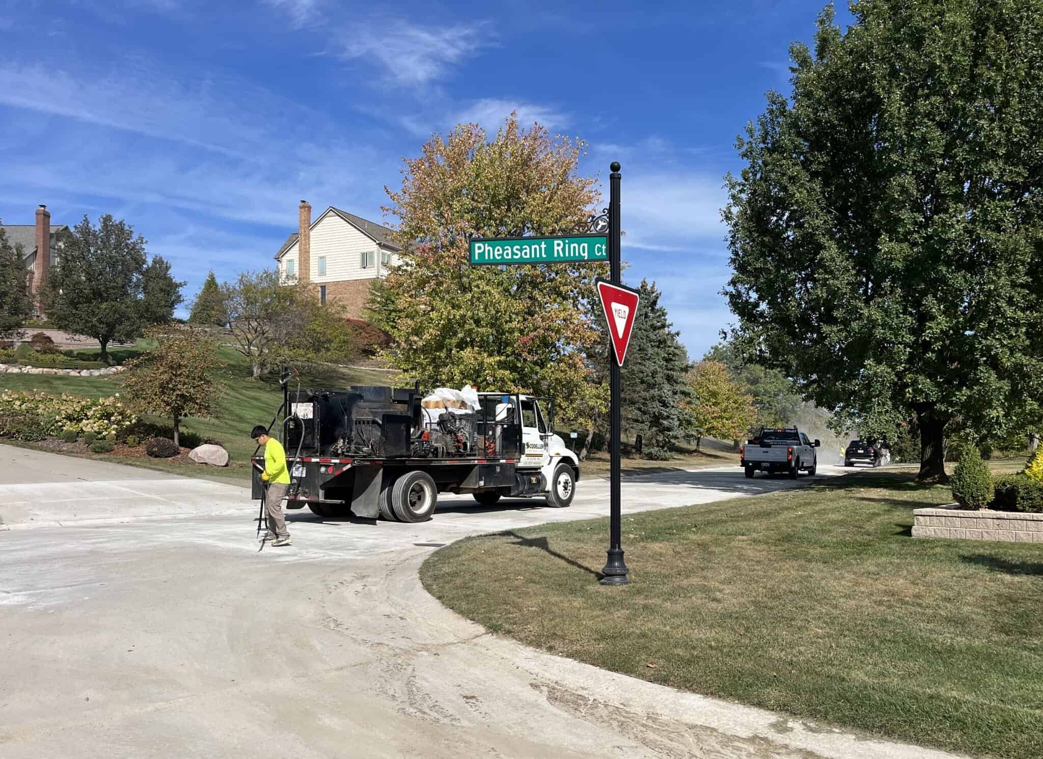Applying curing compound over the surface of concrete paving on Cedar Shake Drive.